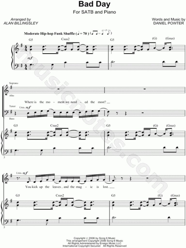 Daniel Powter "bad Day" (Arr. Alan Billingsley) Satb Choir + Piano – Bad Day Piano Sheet Music Free Printable