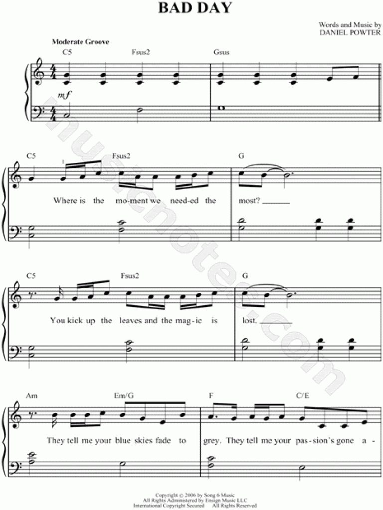 Daniel Powter "bad Day" Sheet Music Notes, Chords | Printable Rock – Bad Day Piano Sheet Music Free Printable