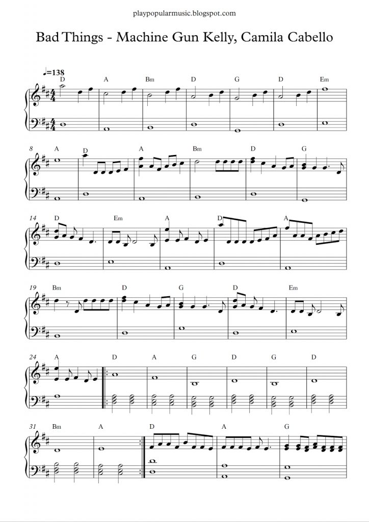Free Piano Sheet Music: Bad Things – Machine Gun Kelly, Camila – Bad Day Piano Sheet Music Free Printable