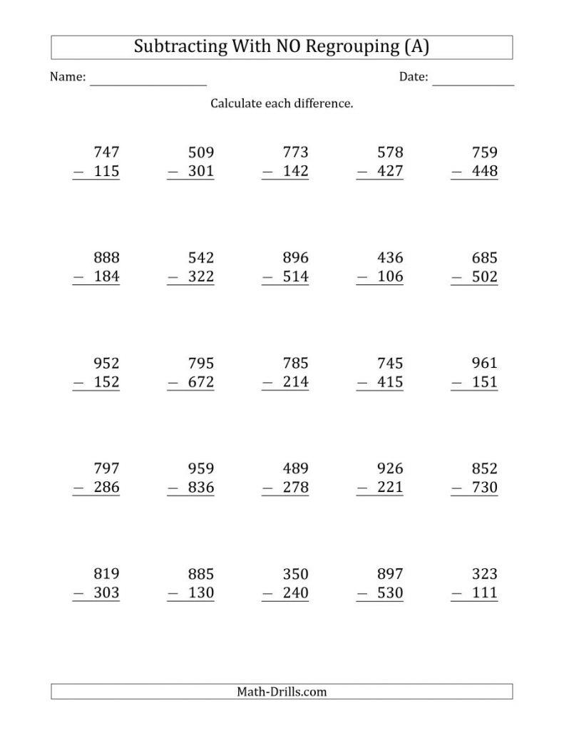 3-Digit Minus 3-Digit Subtraction With No Regrouping (A) – Free Printable 3 Digit Subtraction With Regrouping Worksheets