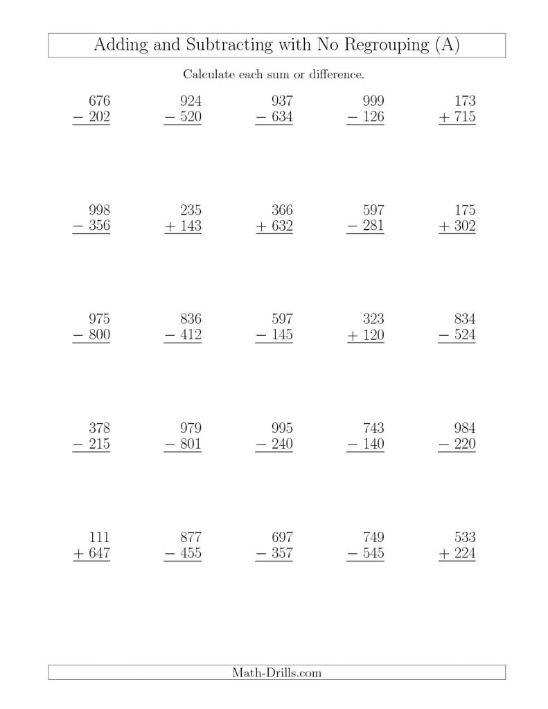 The Mixed Addition And Subtraction Of Three Digit Numbers With No – Free Printable 3 Digit Subtraction With Regrouping Worksheets