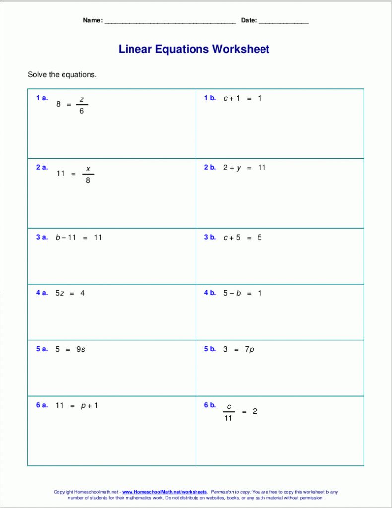 Free Worksheets For Linear Equations (Grades 6-9, Pre-Algebra – Free Printable Algebra Worksheets Grade 6