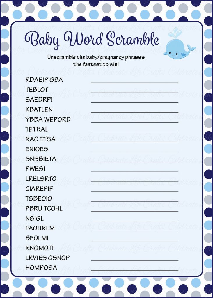 Baby Word Scramble – Printable Download – Navy Gray Whale Baby – Free Printable Baby Shower Games Word Scramble