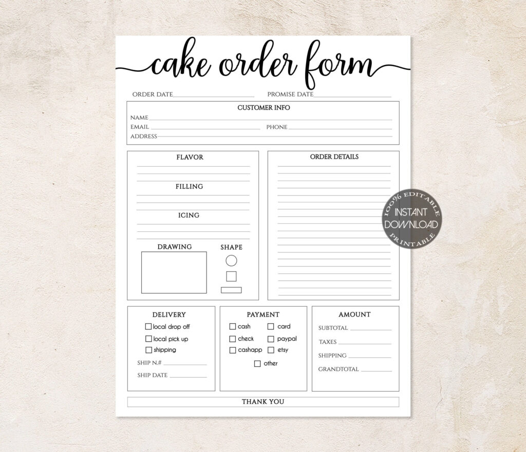 Cake Order Form, Editable Canva Template, Order Forms Template - Free Printable Bakery Order Forms