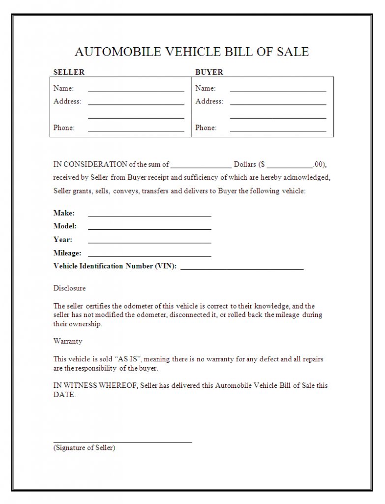 Auto Bill Of Sale Form – Bill Of Sale For A Vehicle Template – Free Printable Bill Of Sale For Car