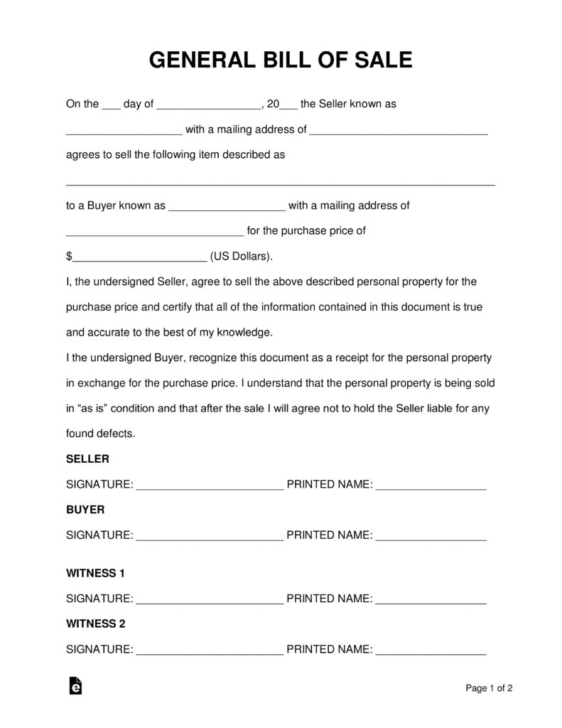 Free General Bill Of Sale Form – Download Pdf | Word – Free Printable Bill Of Sale Form