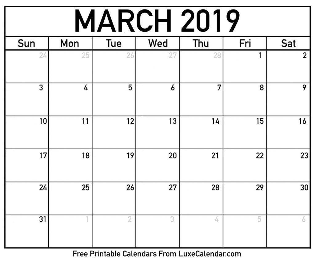 Blank March 2019 Printable Calendar – Luxe Calendar – Free Printable March Activities