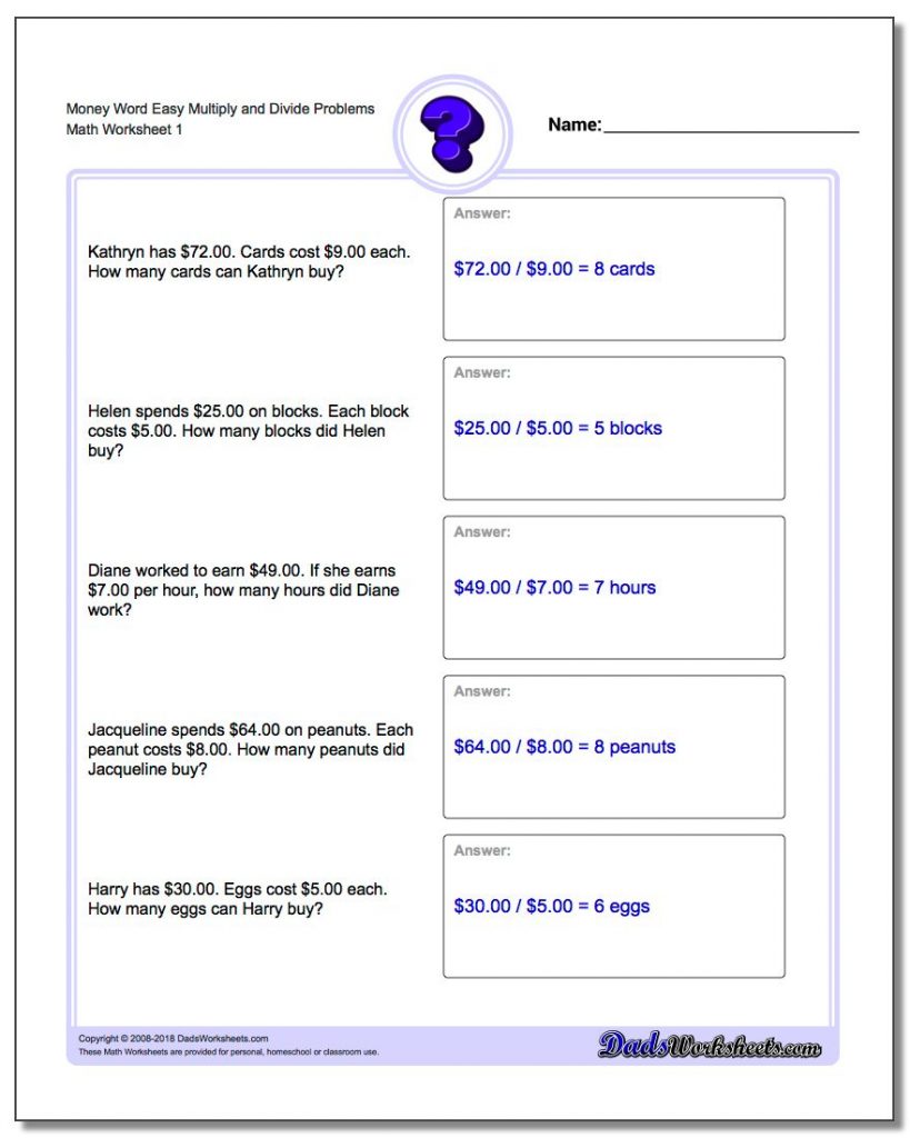 Multiplication Worksheet And Division Worksheet Money Word Problems – Free Printable Money Word Problems Worksheets