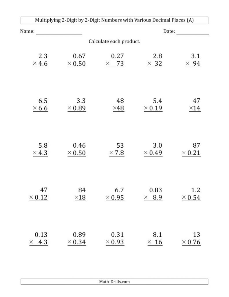 Multiplying 2-Digit2-Digit Numbers With Various Decimal Places (A) – Free Printable Multiplying Decimals Worksheets