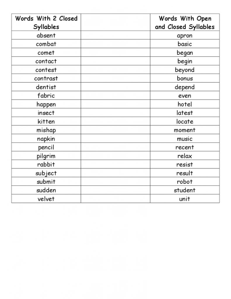 Syllables – Free Printable Open And Closed Syllable Worksheets