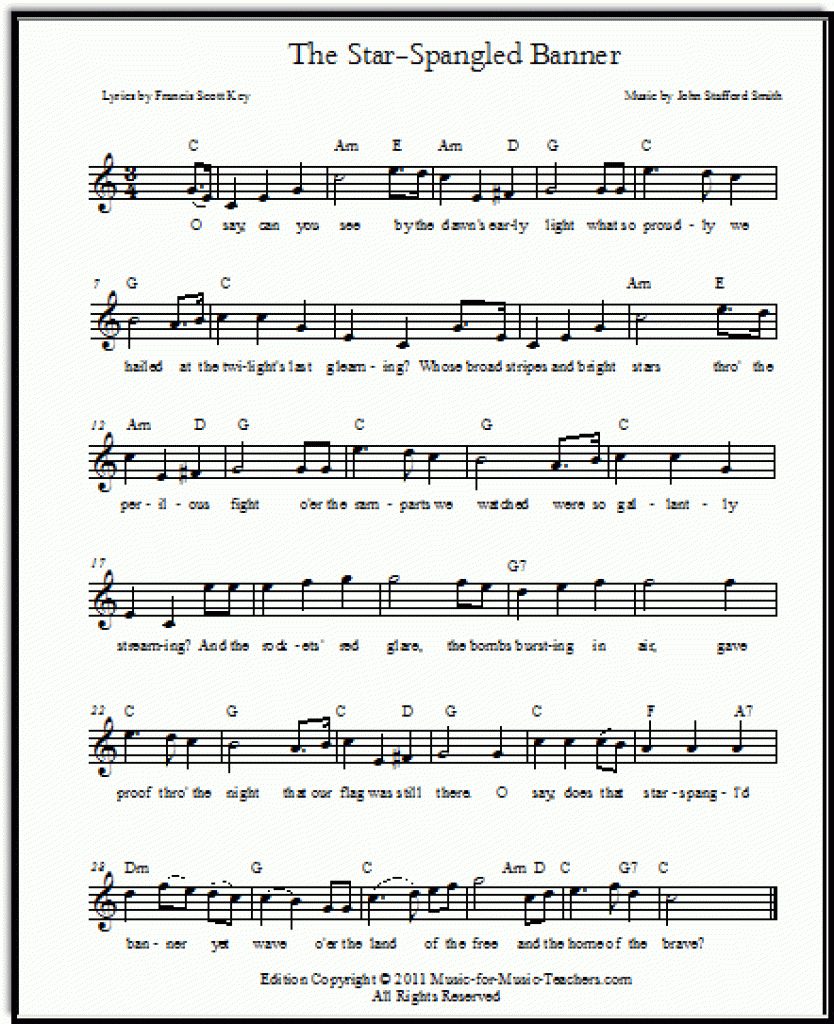 Star-Spangled Banner Free Sheet Music & Lyrics For All Instruments – Free Printable Sheet Music Lyrics