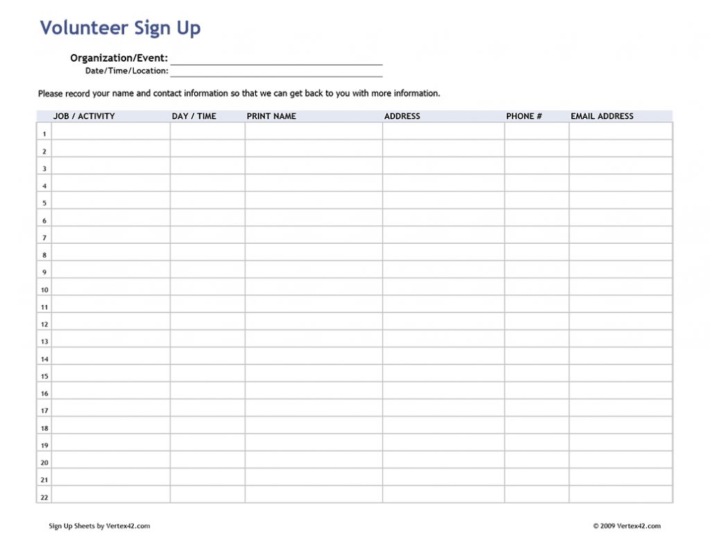 Free Printable Volunteer Sign Up Sheet (Pdf) From Vertex42 – Free Printable Sign In Sheet
