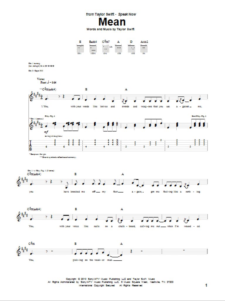 Mean Sheet Music | Taylor Swift | Guitar Tab Within Taylor Swift – Taylor Swift Mine Piano Sheet Music Free Printable